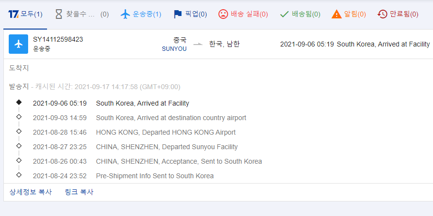 배송 추적을 해보면, 9월 6일에 멈춰있다. 한국에 들어온 이후로는 배송 추적이 안되는 모양이다.